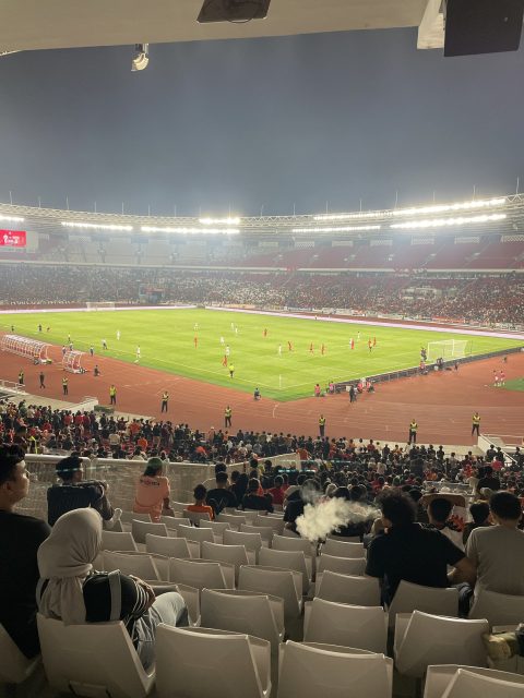 場所はジャカルタ・スナヤンのGBKスタジアム。都心にある77,000人収容の陸上競技場で、日本で言えば国立競技場的な存在です。インドネシアは一年中暑いので試合はほとんどが夜に行われます。